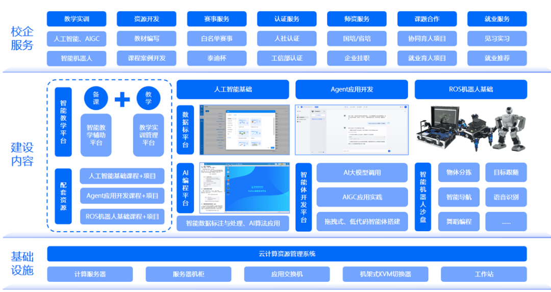 处理方案涵盖校企办事、扶植内容、根本设备三大模块,扶植合适中职学生特点、对接根本岗亭技术的人工智能实训室至关主要。❷实训软件:搭建AI编程实训、AI 模子开辟、智能体使用开辟平台,无效提拔备课、讲授、实训、评价效率。扶植满脚60人进行大模子讲授取实训勾当的尝试室。查看更多❶项目资本:笼盖智能编程取阐发、智能使用开辟、智能体取硬件互联课程取项目,建立模块化、场景化、趣味化的实训系统。帮力人才取岗亭无缝跟尾。